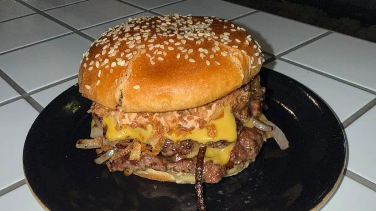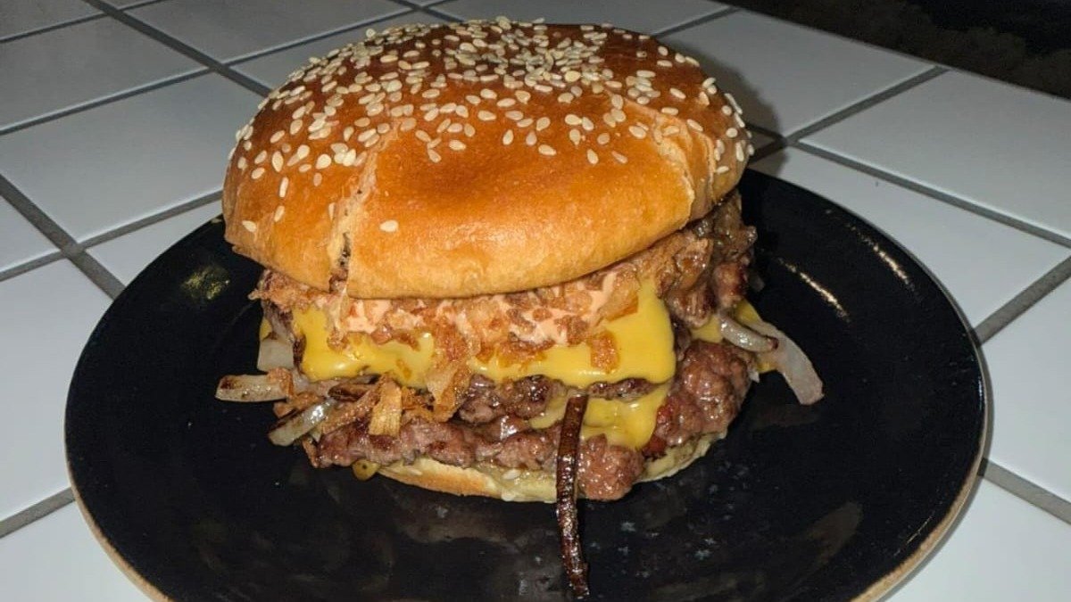 2 Beef Patty / Sesame Bun / White Onion / Crispy Onion / Bacon Jam / Thousand Island Sauce / Tripple Cheese