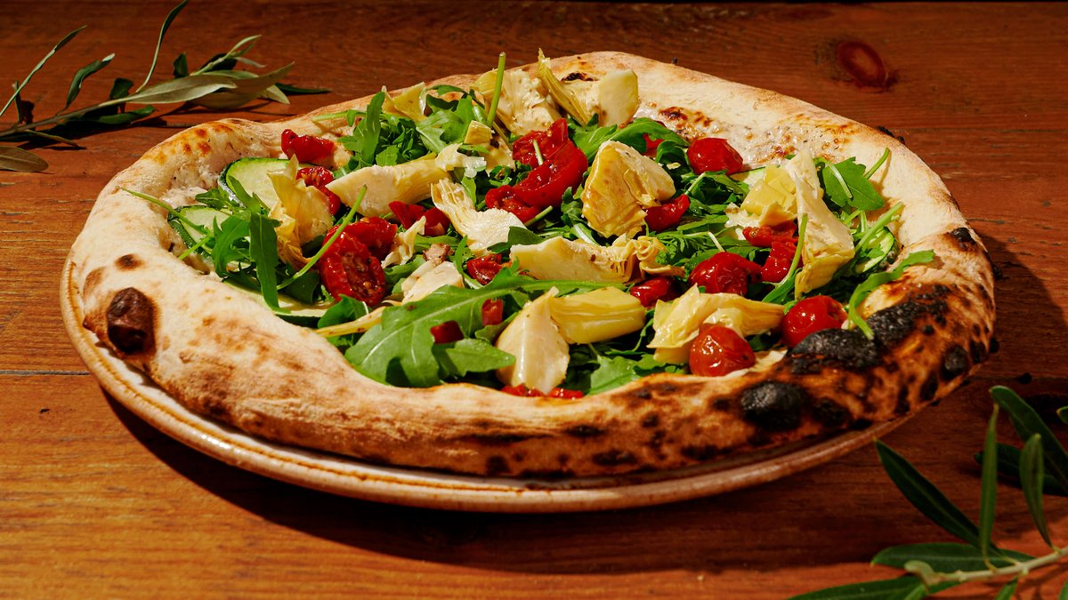 Vegansk pizza med tomatsaus, chili, rød pepper, løk, ruccola, friarielli, olivenolje og solsikkefrø. Vegansk.