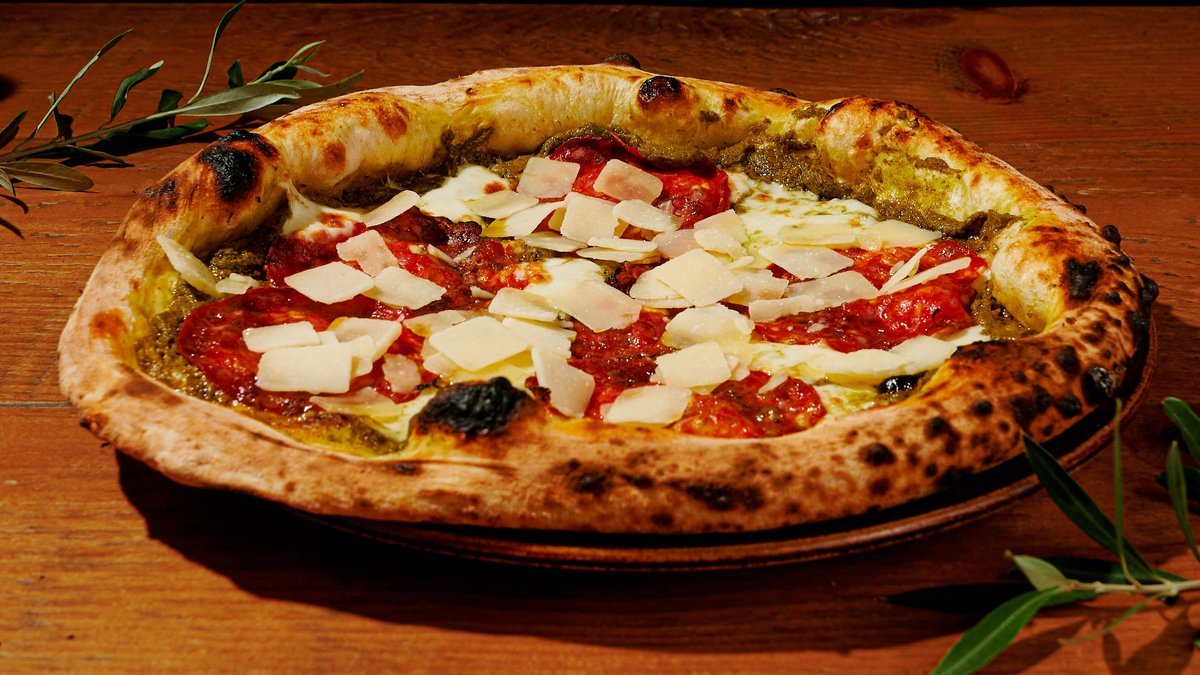 Tomatsaus, mozzarella, Calabrian nduja, rødløk og gorgonzola.