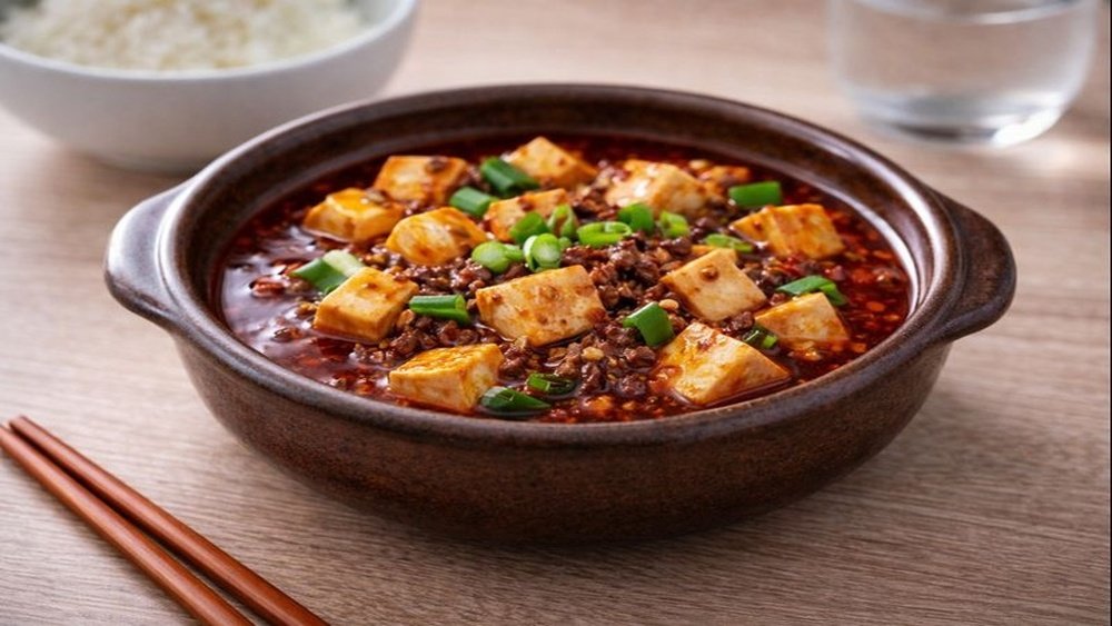 Stir-fried tofu with minced beef in a chili and pepper sauce.