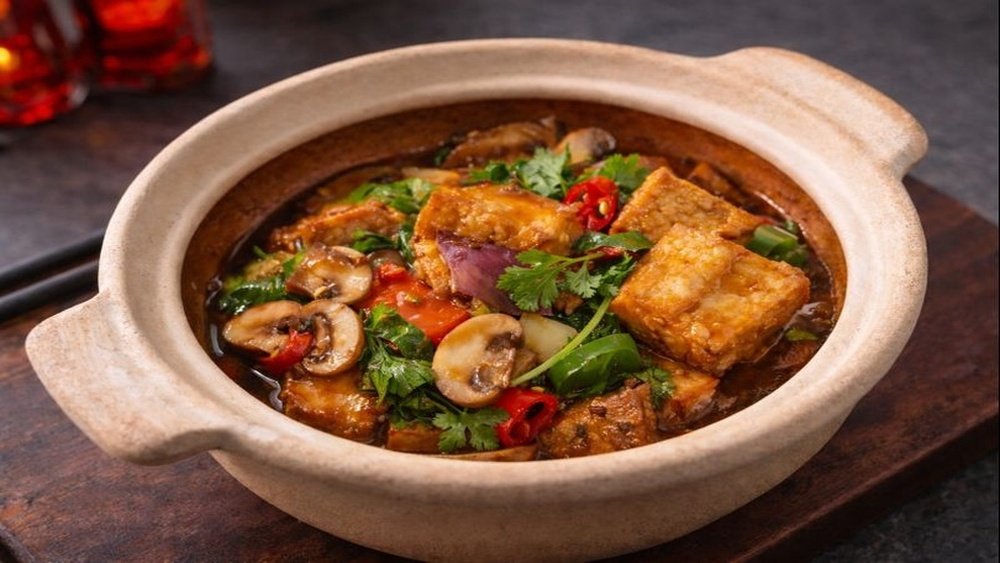 Tilberedt tofu i fyldig saus med grønnsaker og aromasopp.