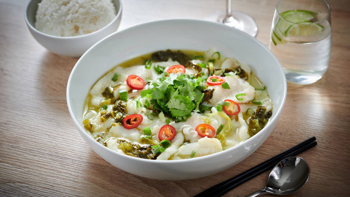 Saftig fiskefilet i en syrlig suppe med syltet Sichuansk kinakål.