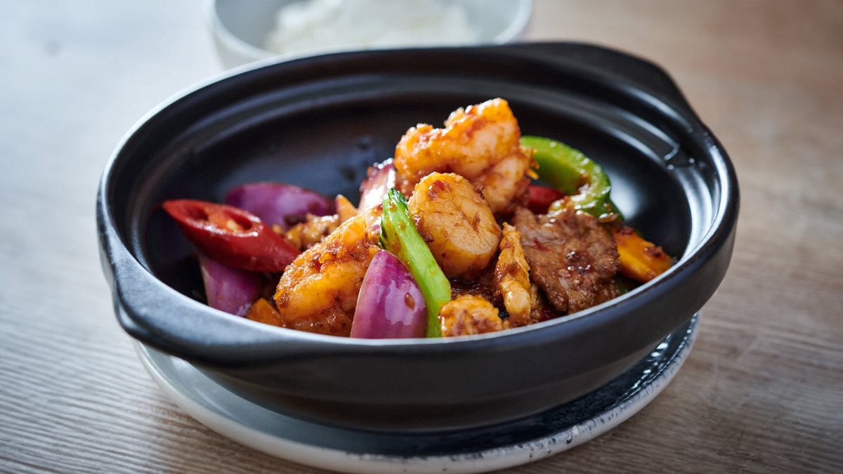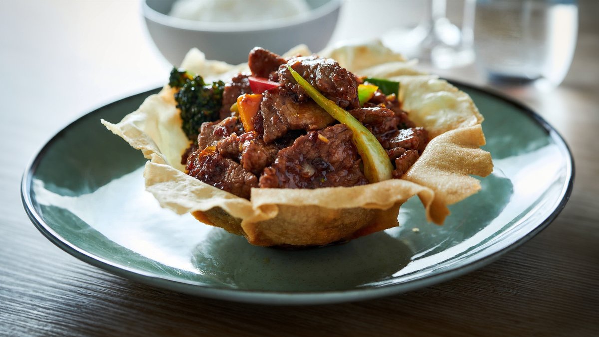 Mørt storfekjøtt woket med chilli, koriander og klassiske krydder fra Hunan province.