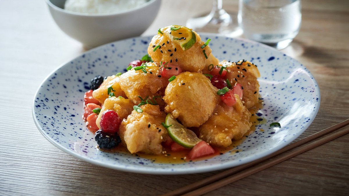 Crispy, sticky kyllingbiter med frisk og søt appelsinsaus.