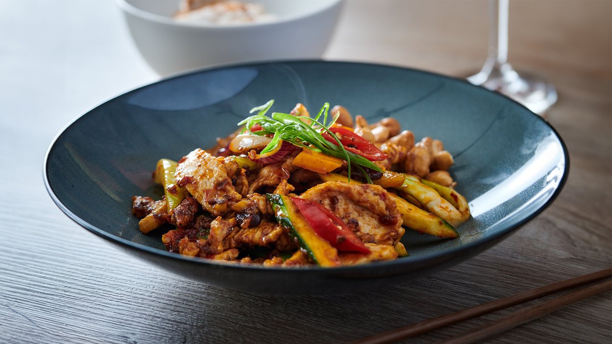 Woket kylling med sesongens grønnsaker, cashewnøtter og tørket chili i lett søt-sur saus.