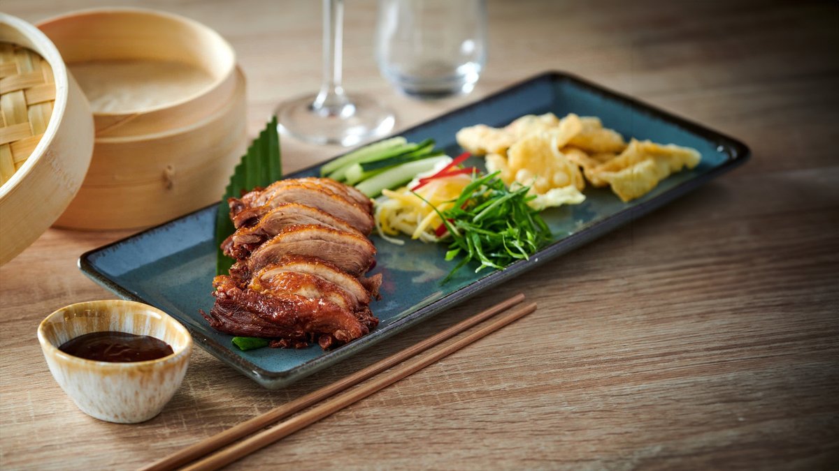 Med pannekaker, vårløk, agurkstrimler og hoisinsaus.