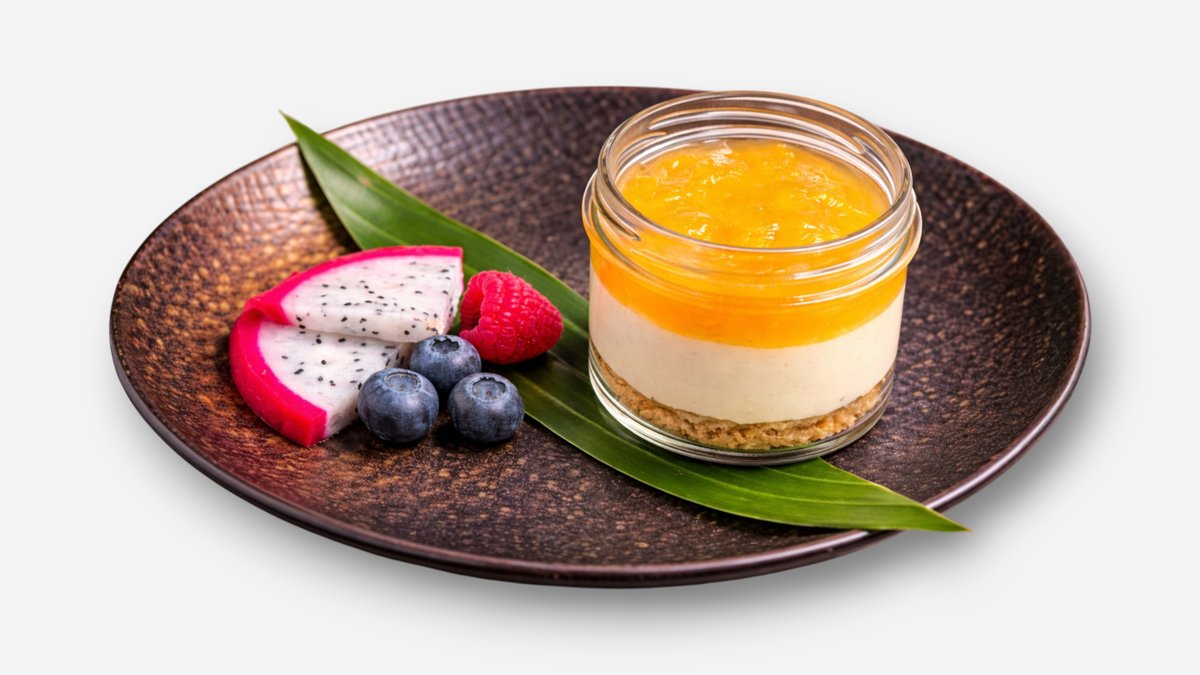 Kremet ostekake med sprø kjeksbunn og friske røde bær.