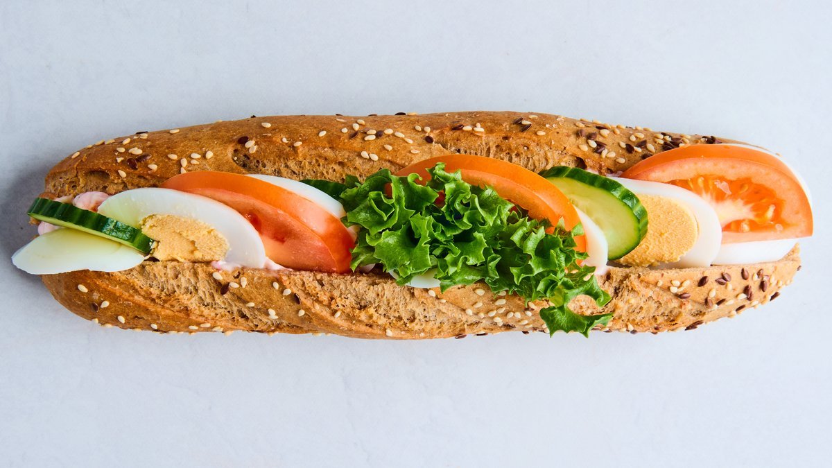Baguette med kokte egg og tomater. Velg mellom fint eller grovt brød.