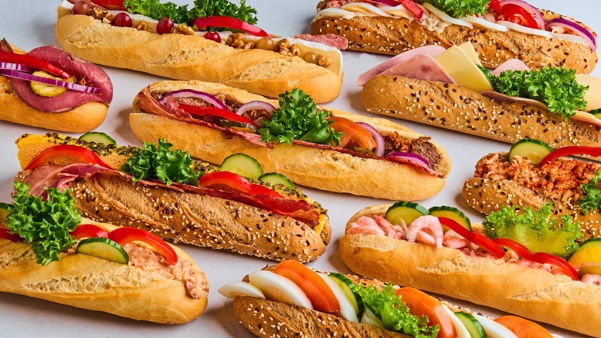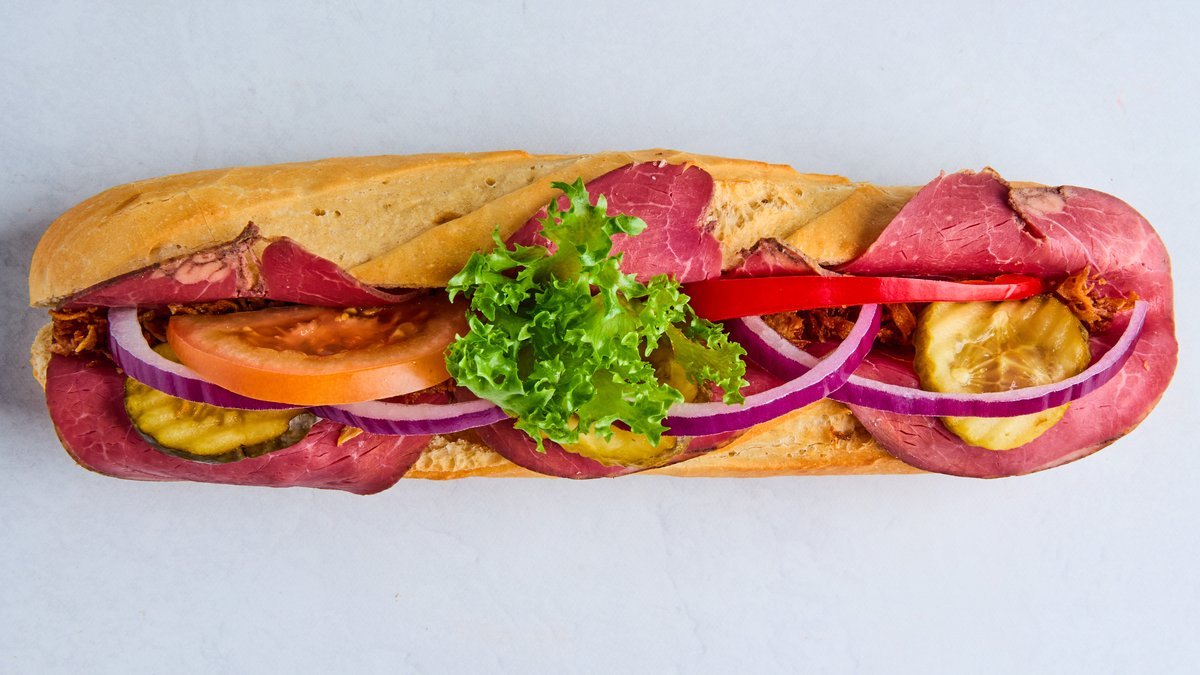 Baguette med roastbiff og potetsalat eller remoulade. Velg mellom fint eller grovt brød.