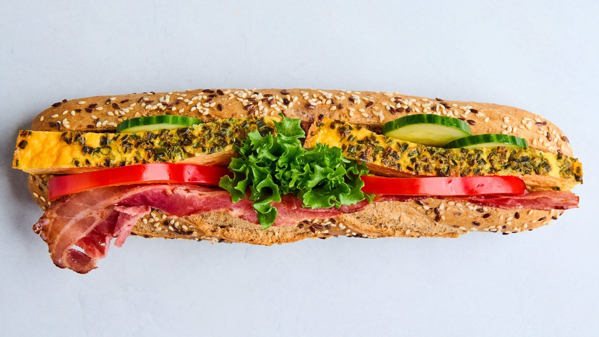 Baguette med bacon og eggerøre. Velg mellom fint eller grovt brød.