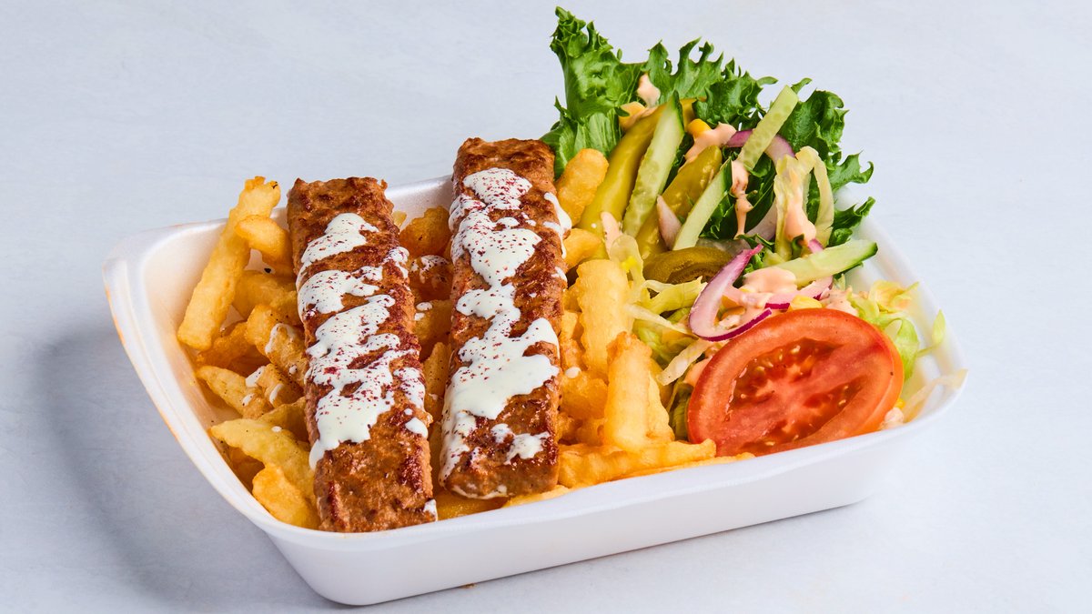 Texasburger med kebabkjøtt, grønnsaker og pommes frites. Velg ønsket størrelse i valgmeny under.
