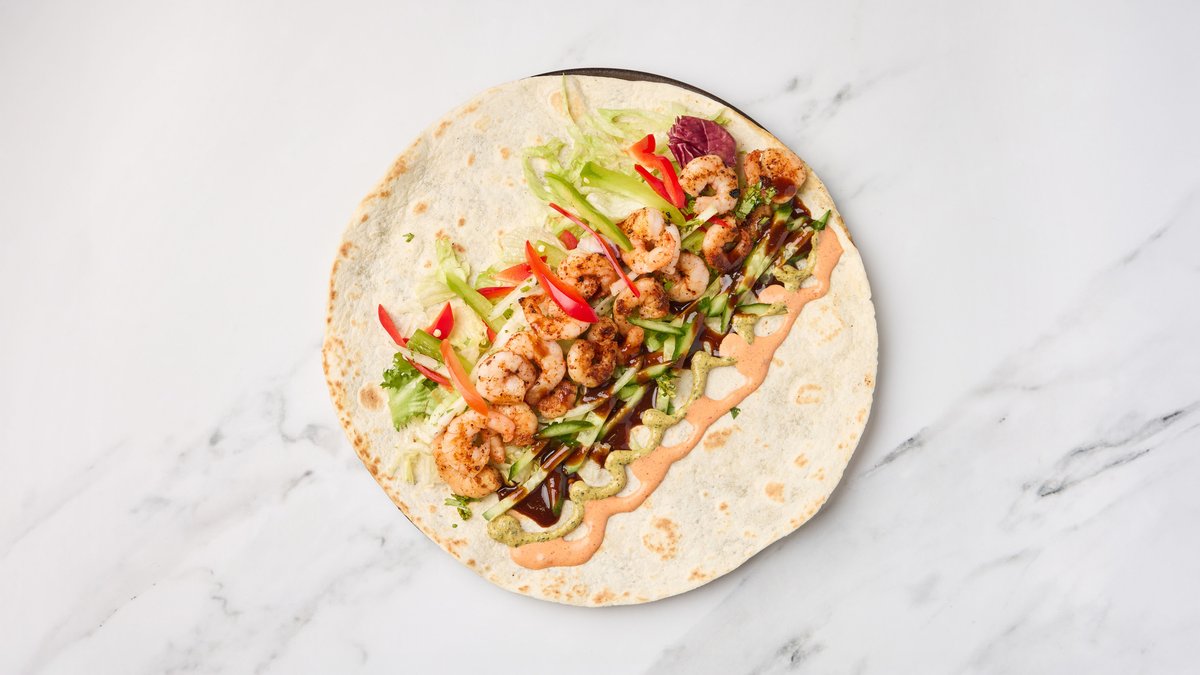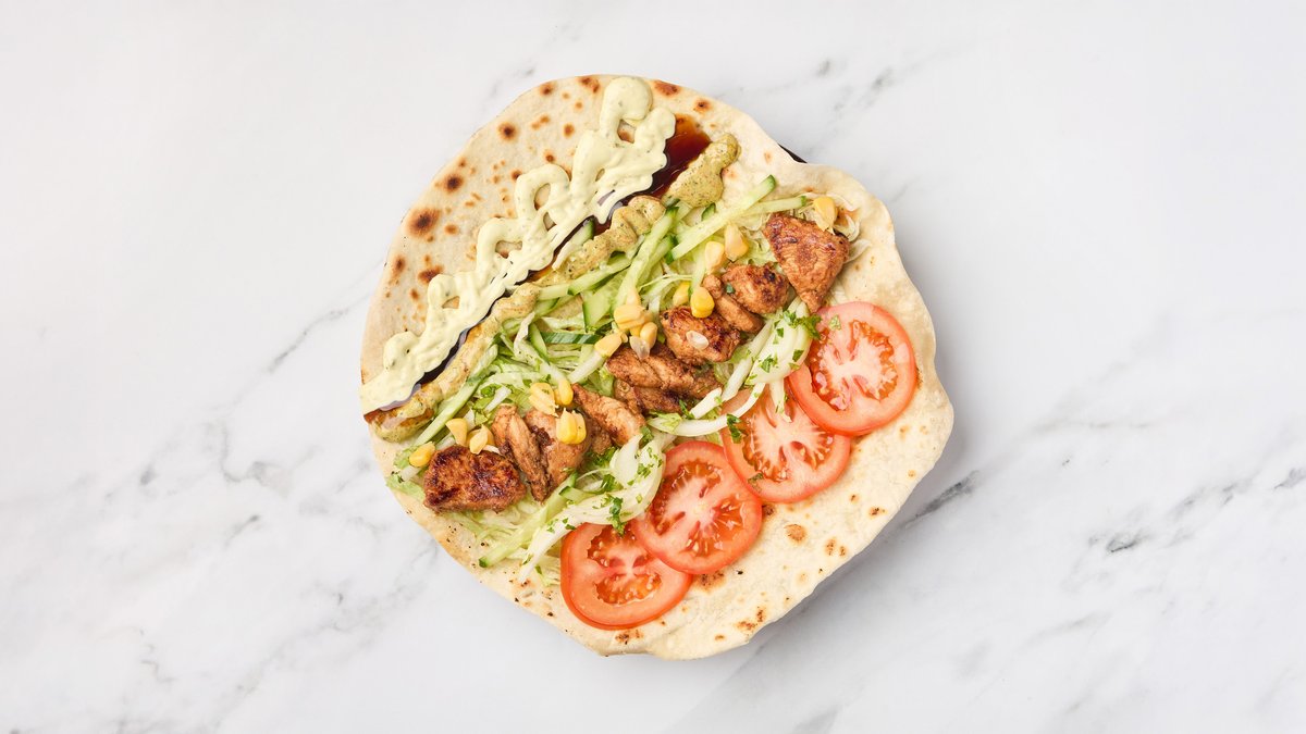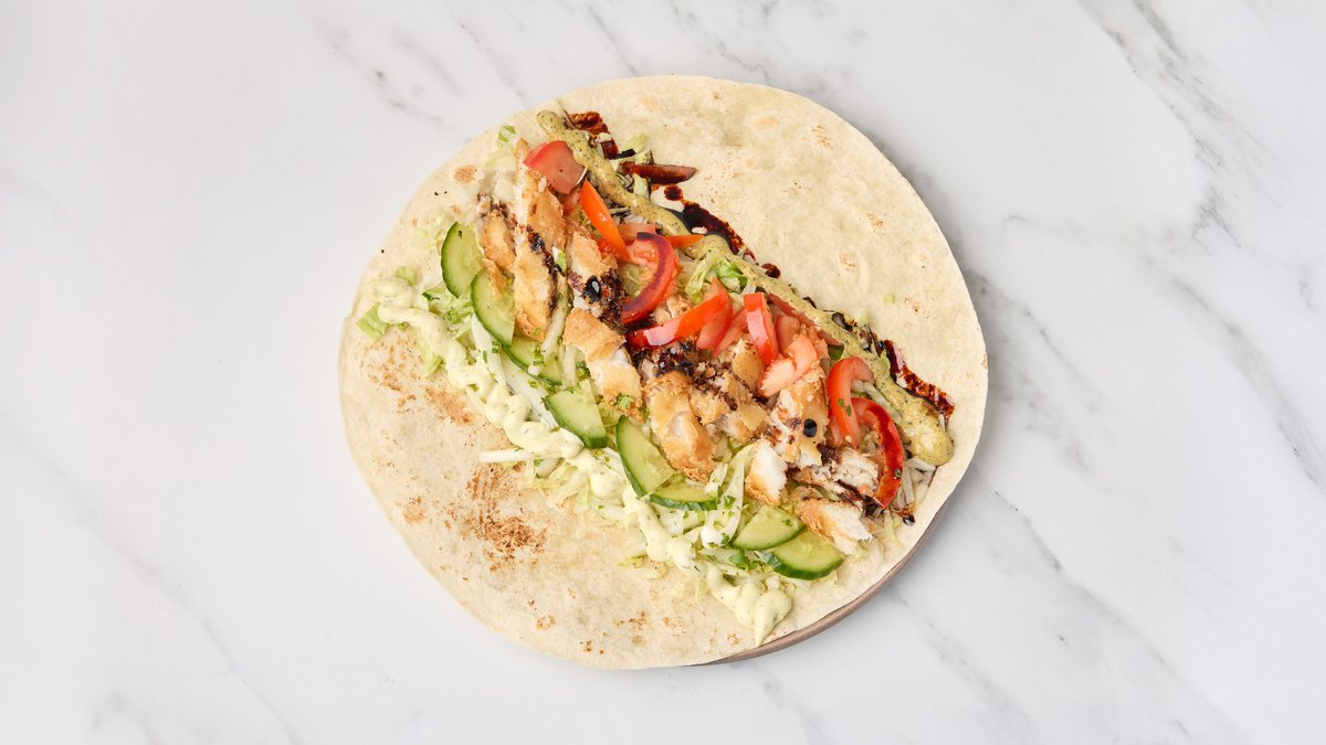 Kyllingkjøtt, tikka krydder, isbergsalat, grønnsaker og dressinger.