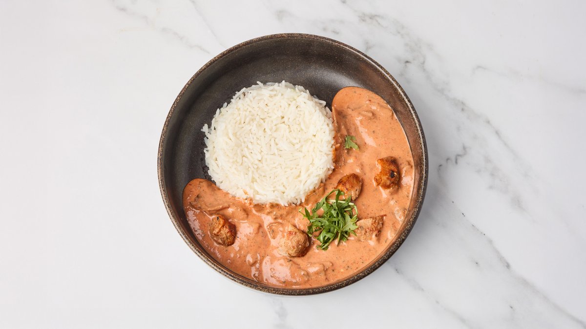 Marinerte kylling biter med tikka saus. Serveres med ris.