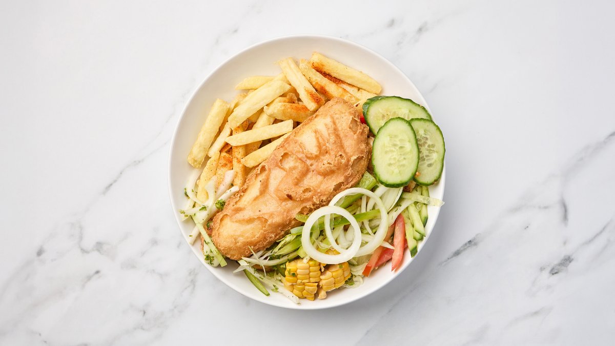 Innbakt og fritert fisk med pommesfrites og salat.