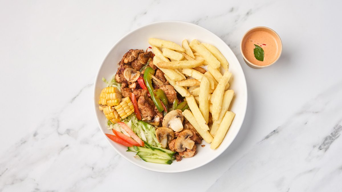 Marinert kylling stekt med paprika og sjampinjong. Serveres med salat og valgfritt tilbehør.