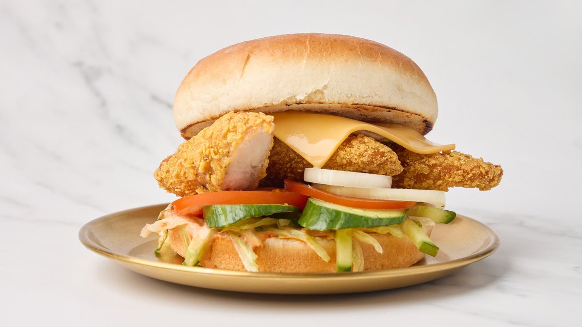 Fritert kyllingbryst med salat, karamellisert løk, salat og tomat. Chicken burger. Serveres med pommes fries og chipotle-aioli.
