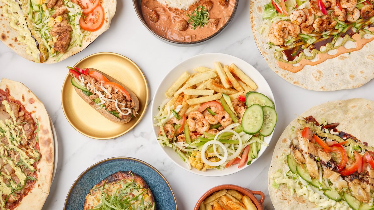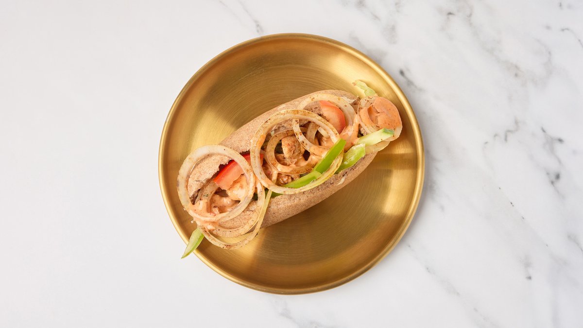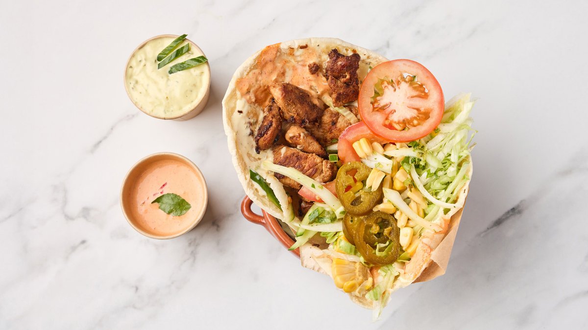 Grillede kyllingskiver, paprika, taratour-saus, salat, syltede grønnsaker, ost og aioli. Serveres med valgfri drikke.