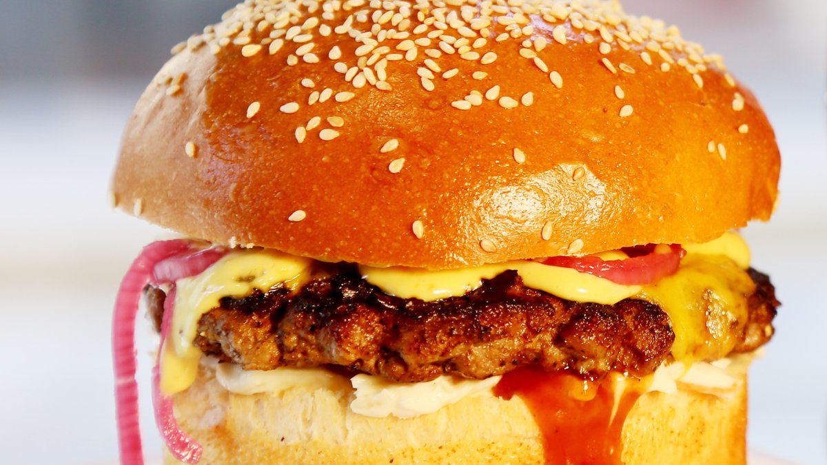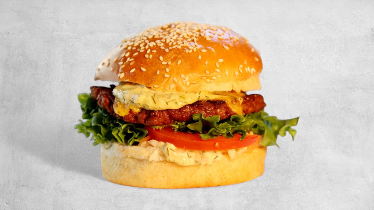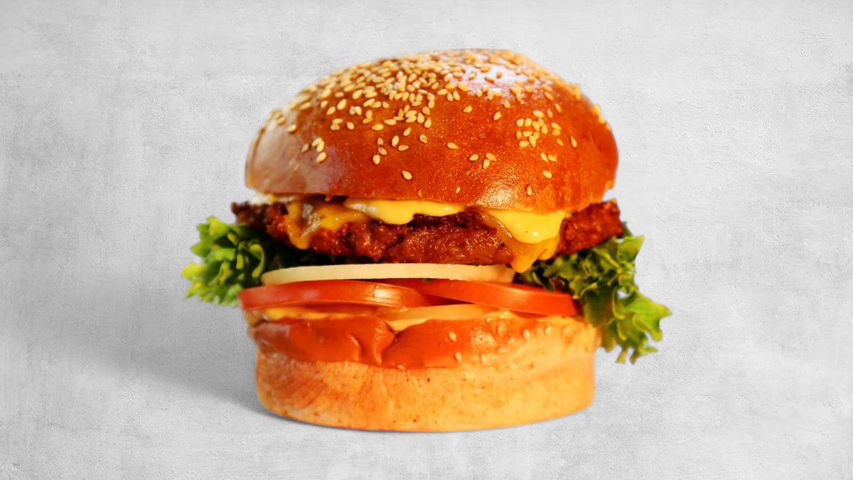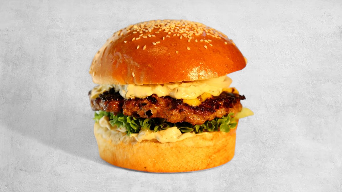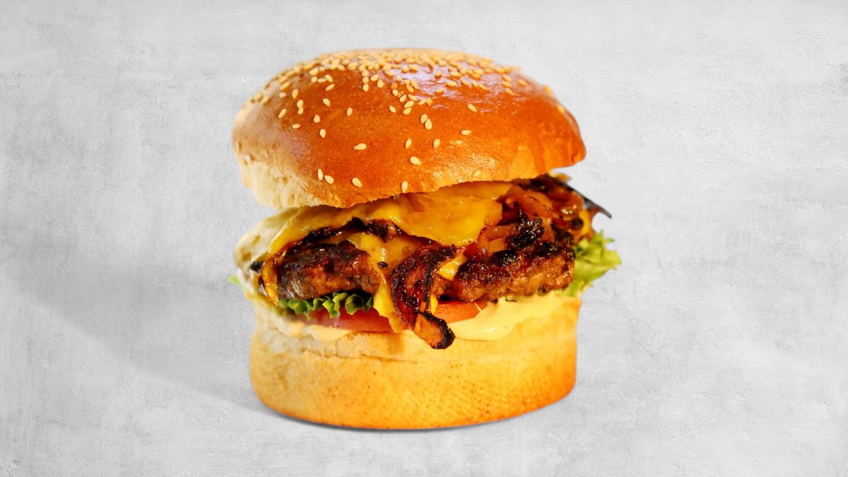 Beyond burger med Pickles mash with onion & tomato, salad, fried onion ,cheese & burger dressing.