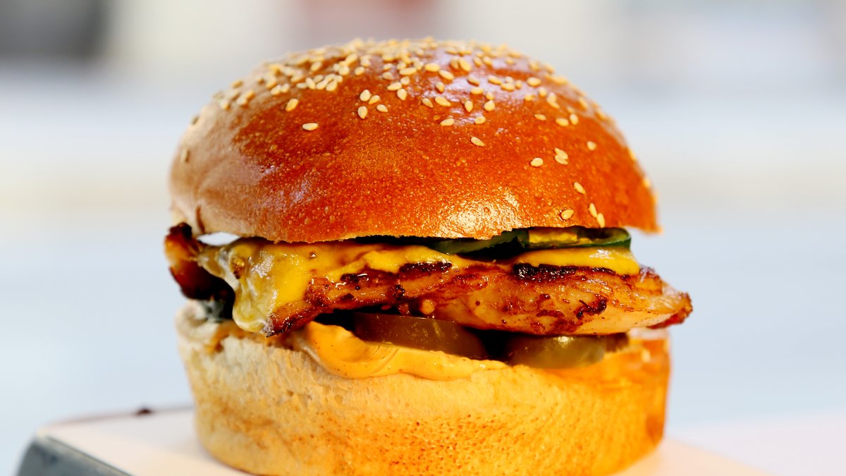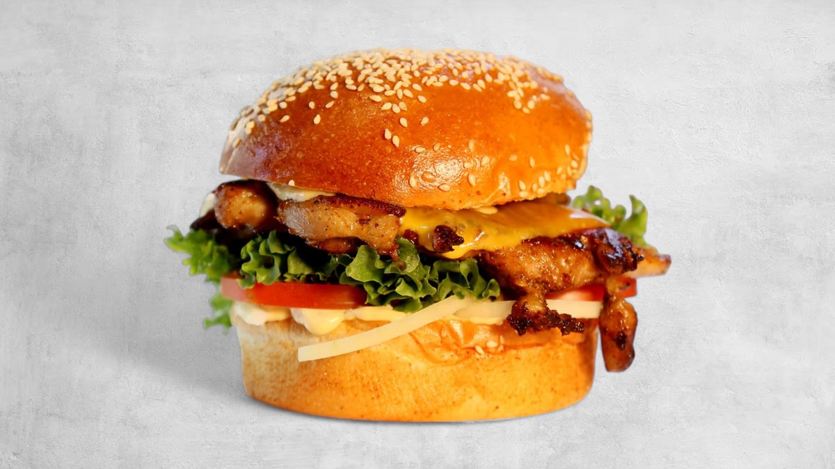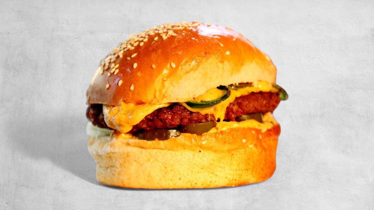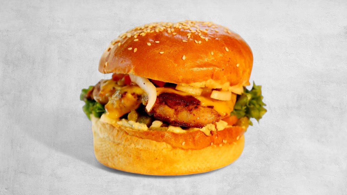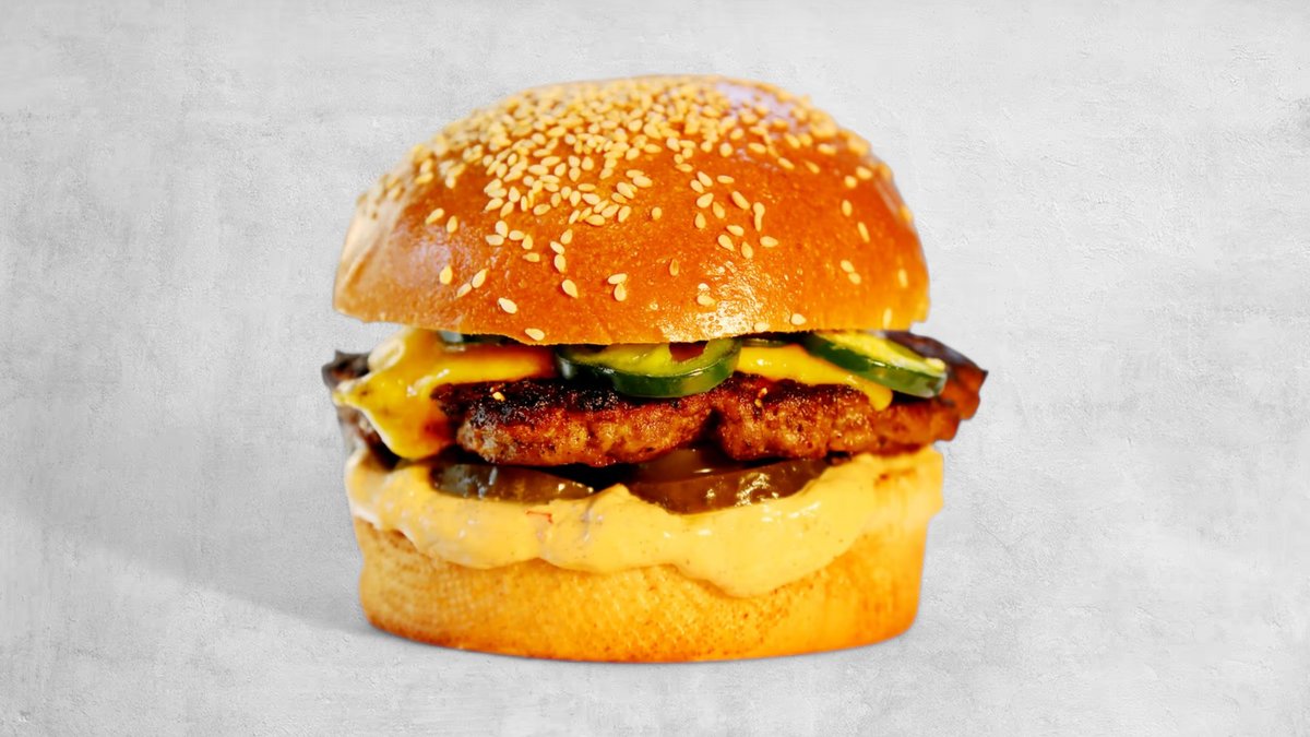 Beyond burger med Jalapeño, pickles, fresh chili, cheese, fried onion & Chili mayonnaise dressing.