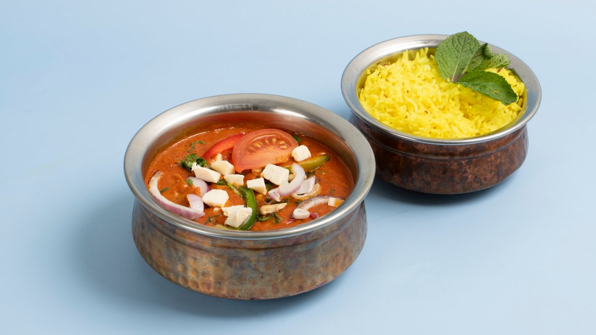 Stekt hjemmelaget ost tilsatt løk, tomater og sjampinjong i masalasaus.