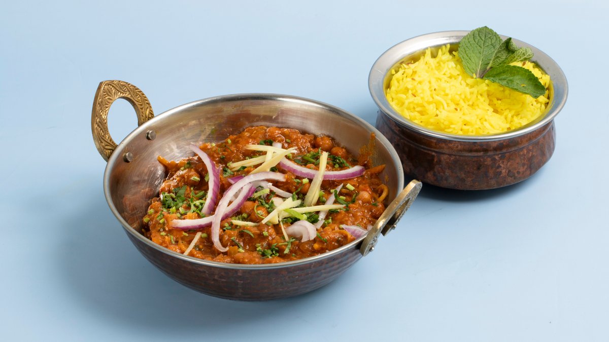 Kikerter stekt i panne med løk, tomater, koriander og krydder.