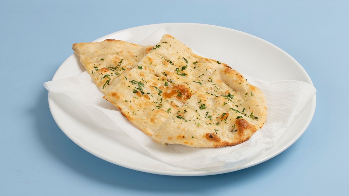 Fersk brød fylt med hvitløk og koriander, stekt i tandoori ovn, penslet med smør.