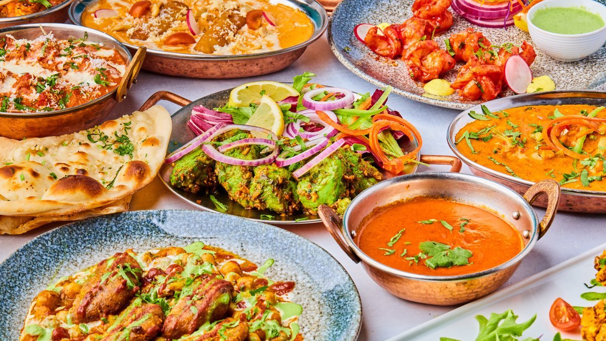 En sammensetning av ulike Kull tandoor grillede retter, servere med saus, ris og salat.
