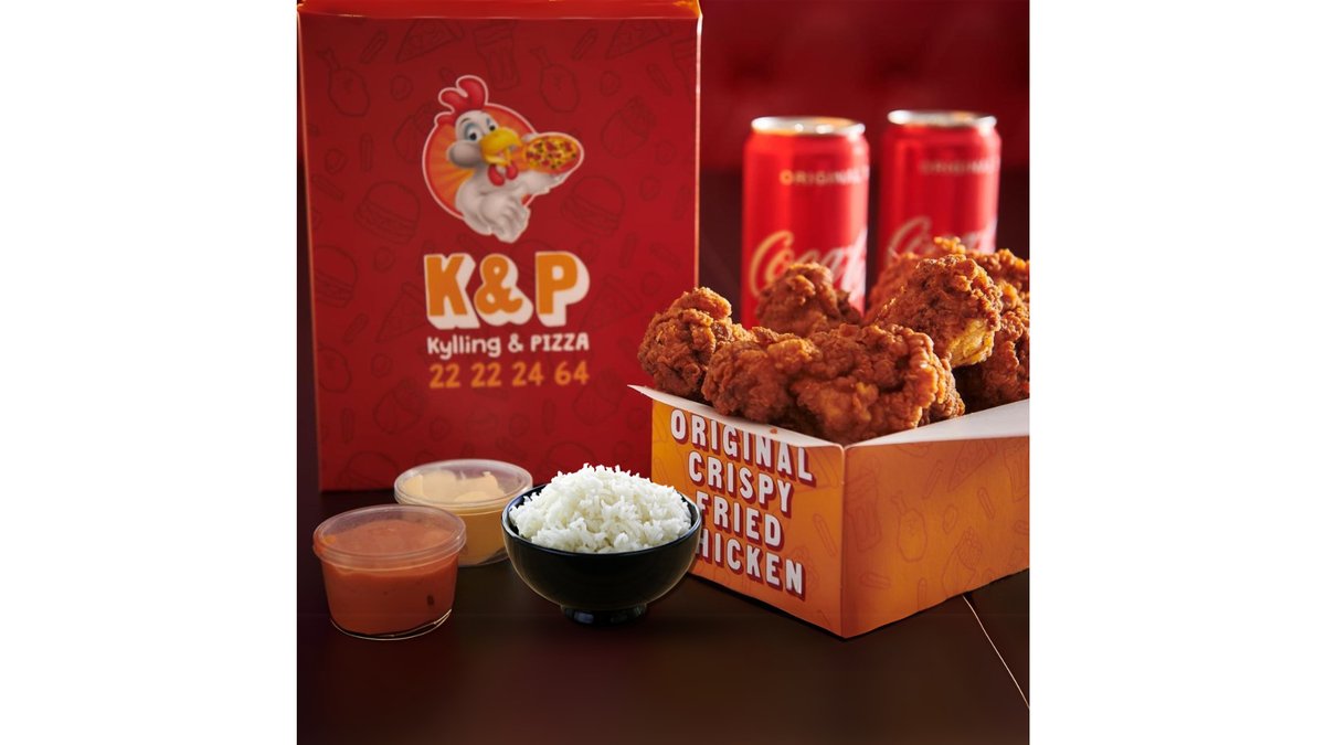 3 wings, 1 tender, 1 leg or thigh, rice and 1 drink 0,33l.