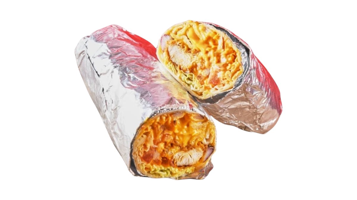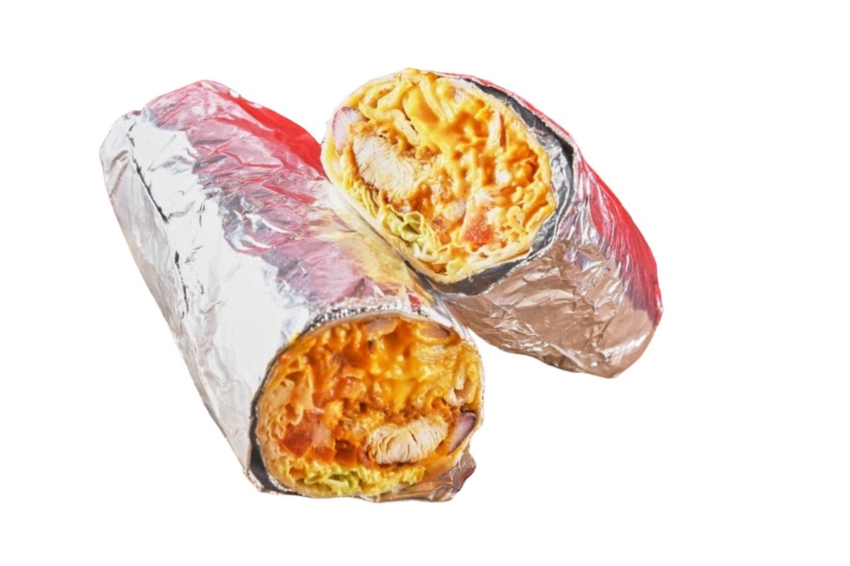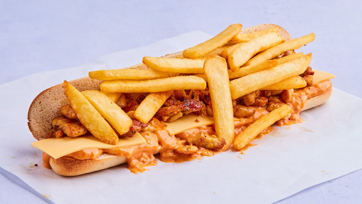 Baguette med tikkamarinert kylling, ost, tomat og fries.