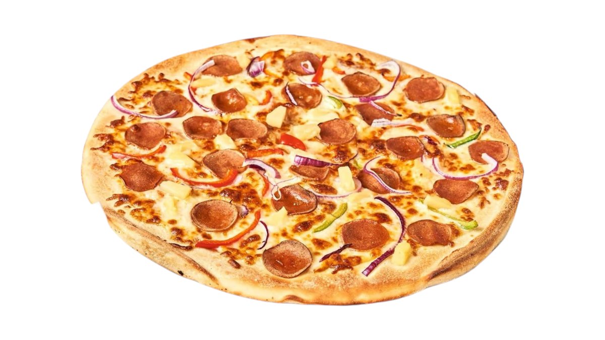 Pizza med tomatsaus, ost, pepperoni, paprika, løk og ananas.