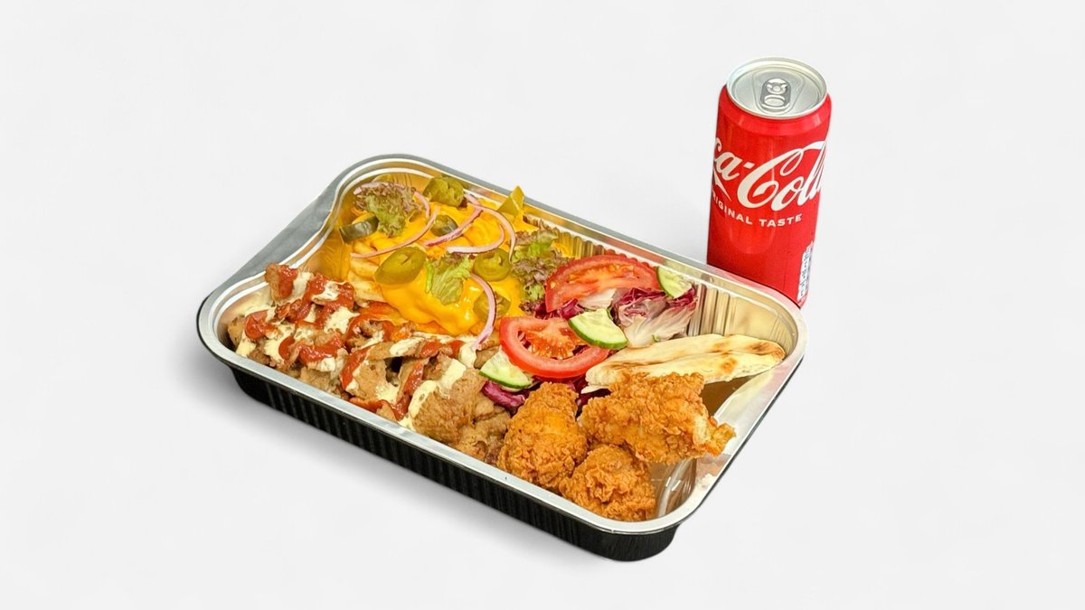 3 wings, 1 tender, 1 leg or thigh, fries and 1 drink 0,33l.