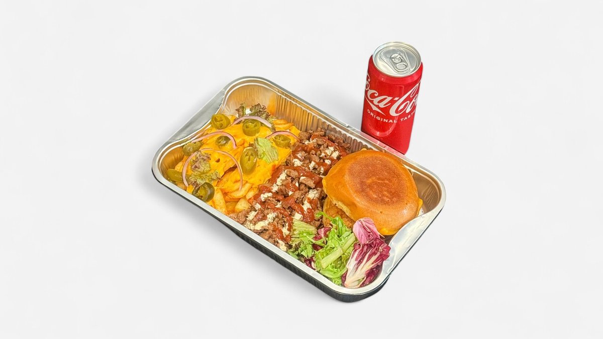 Med storfekjøtte, ost, paprika, løk, "special" saus og pommes frites.
