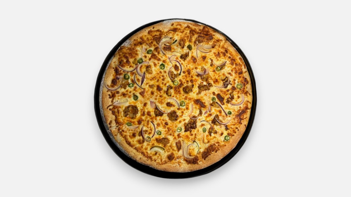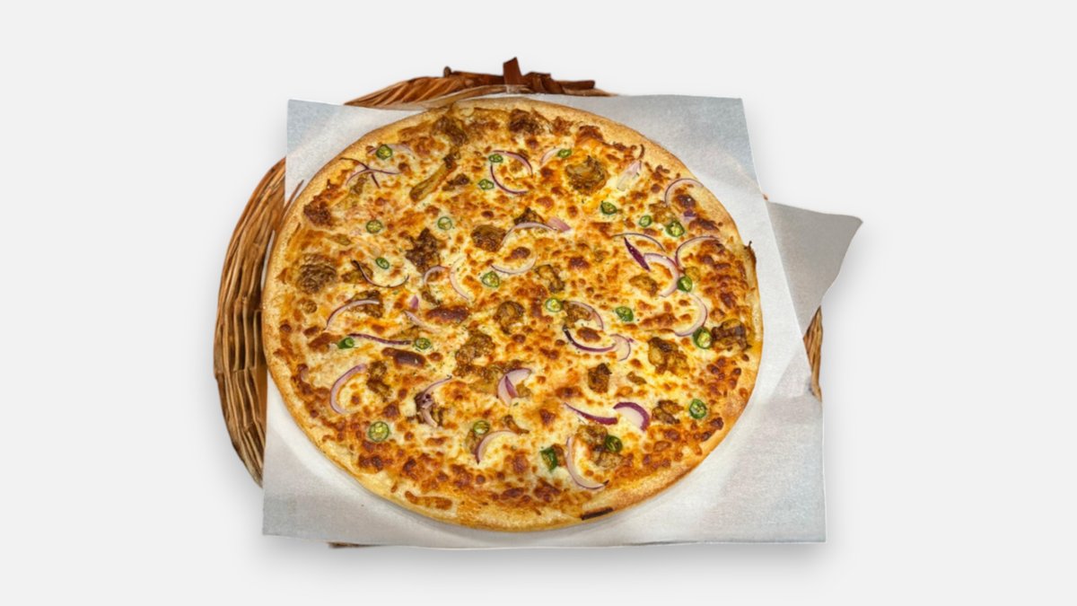 With tomat saus, cheese, spicy chicken, green chilli, onion