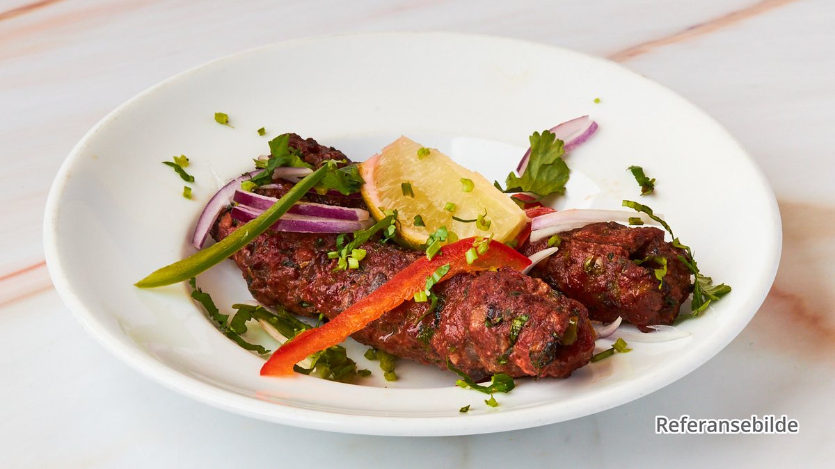 Velg styrke 3 stk. grillet biffkebab kjøttdeig servert med ris, saus, salat og plain naan.