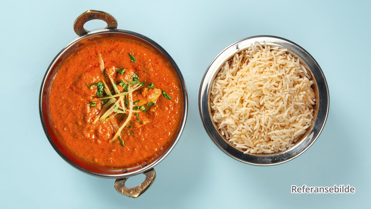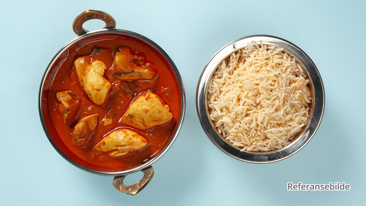 Kyllinglår tilberedt i currysaus. Serveres med ris, salat og plain naan.
