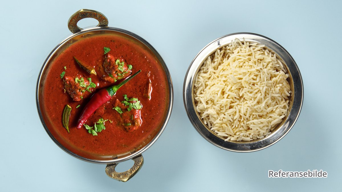 Lammebiter med grønn chili, ingefær og koriander i fersk tomatsaus. Serveres med ris, nanbrød og salat.