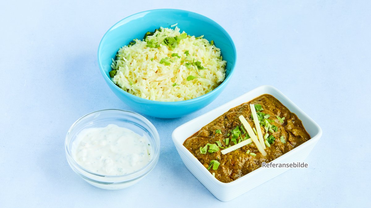 Lam tilberedt med krydder, urter og nøtter i en mild kremet saus. Serveres med ris, salat og naan
