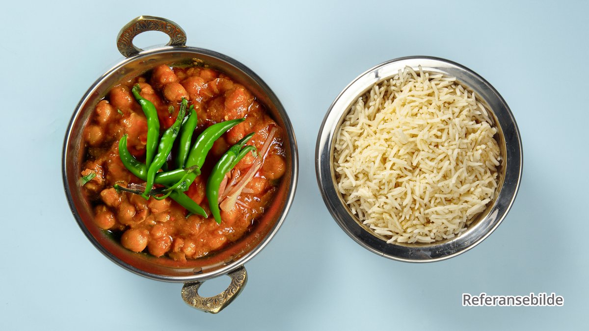Kikerter og spinat i masalasaus. Serveres med ris, nanbrød og salat.