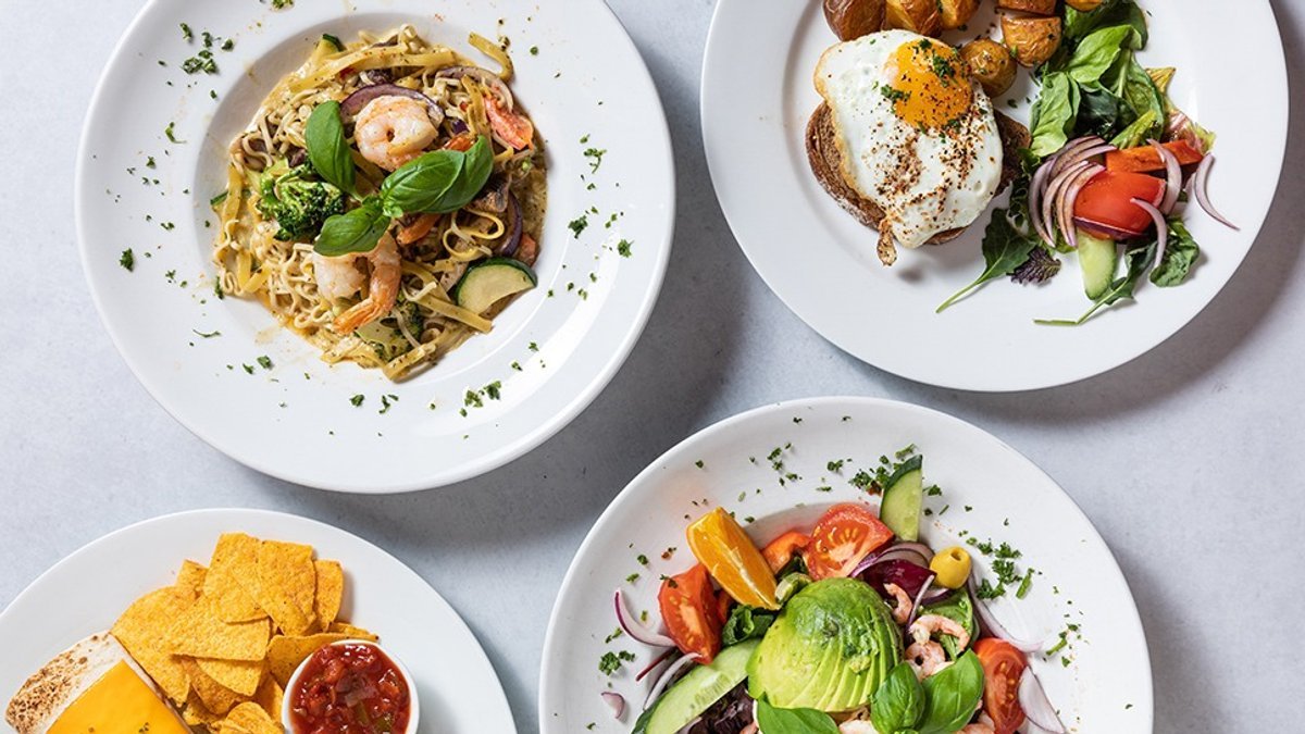 Serveres med kyllingfilet, blandet salat, tomat, agurk, rødløk, krutonger og parmesan