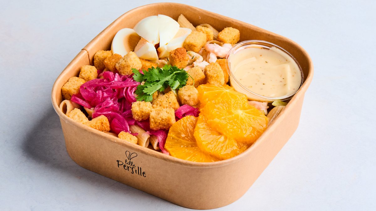 Skagenrøre med håndpillede reker, egg, appelsin, syltet rødløk, fullkornpasta, krutonger og hvit balsamicovinaigrette.