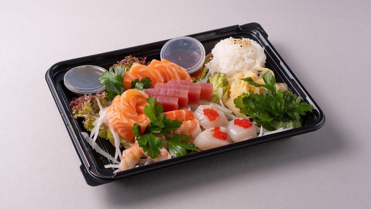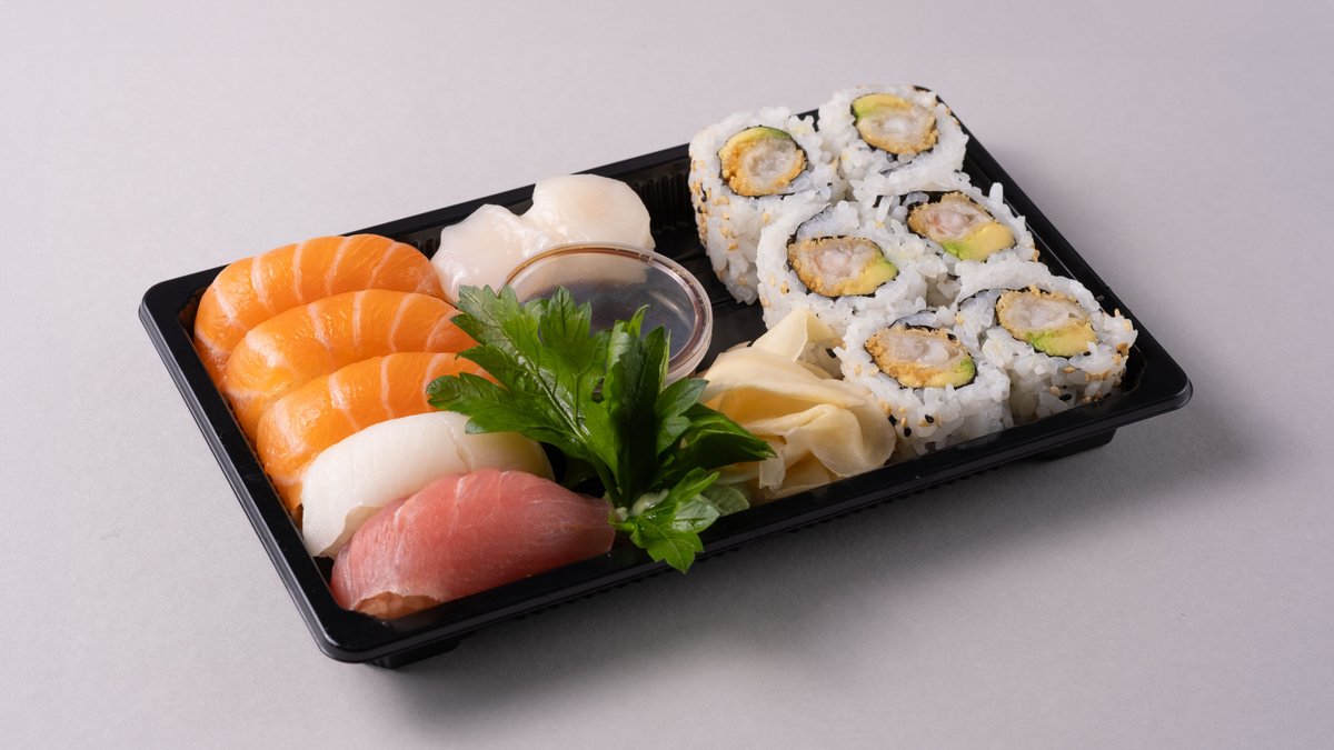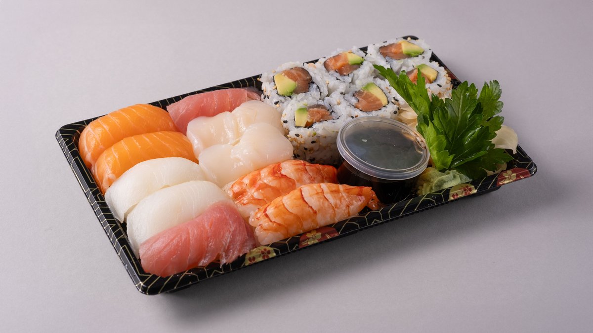 22 biter. Nigiri: 2 laks, 2 halibut, 1 tuna, 1 kamskjell, 1 scampi og 1 rødskjell. Sashimi: 4 laks og 4 tuna og 6 tempura maki.