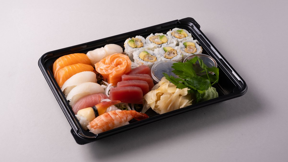 60 biter. 16 laks, 4 halibut, 4 tuna, 4 scampi, 4 kamskjell, 6 laks maki, 6 fritert hel rull scampi maki m/ chilimayo, 6 spicy tuna maki og 6 tempura maki.