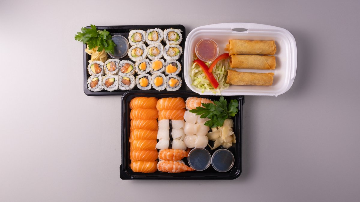 39 biter. 9 laks, 3 halibut, 3 scampi, 3 kamskjell, 6 laks maki, 6 spicy tuna maki, 6 tempura maki og 3 vårrull.