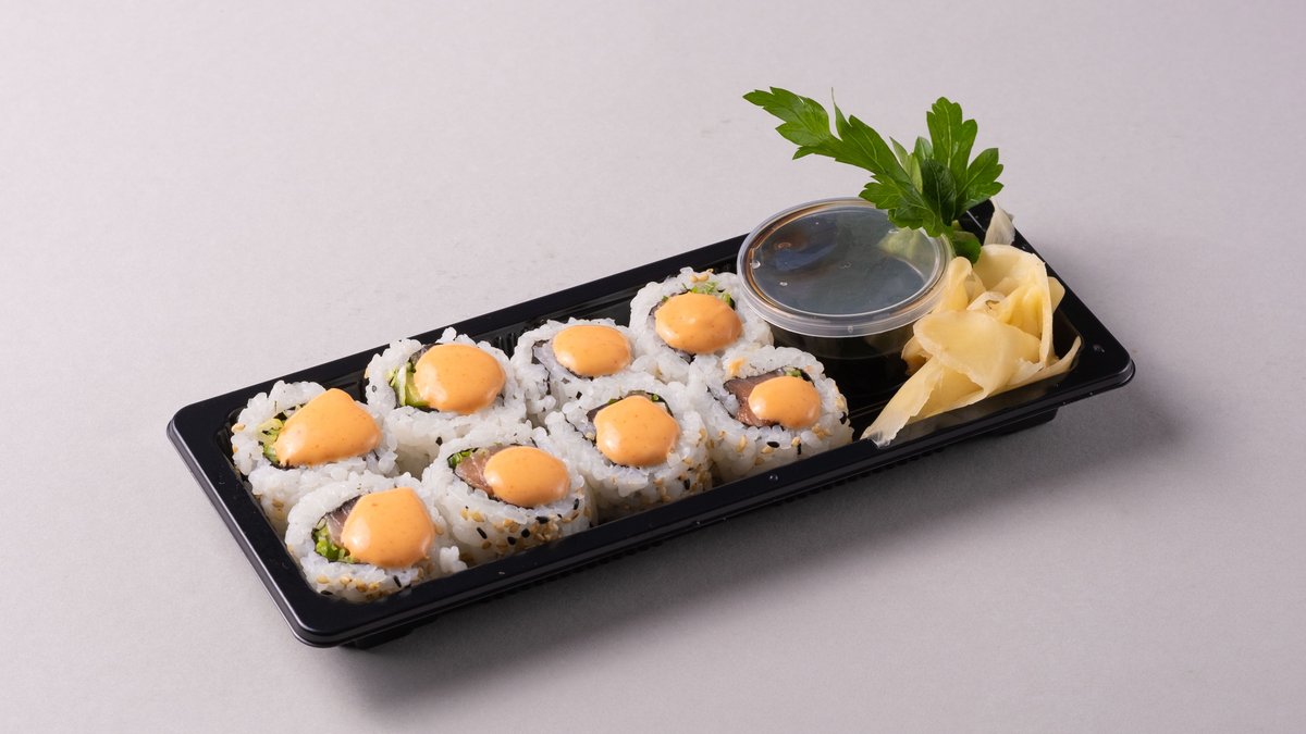 Rull med fritert scampi, avokado og agurk. Toppet med flambert tuna, chilimayo og teriyaki saus.