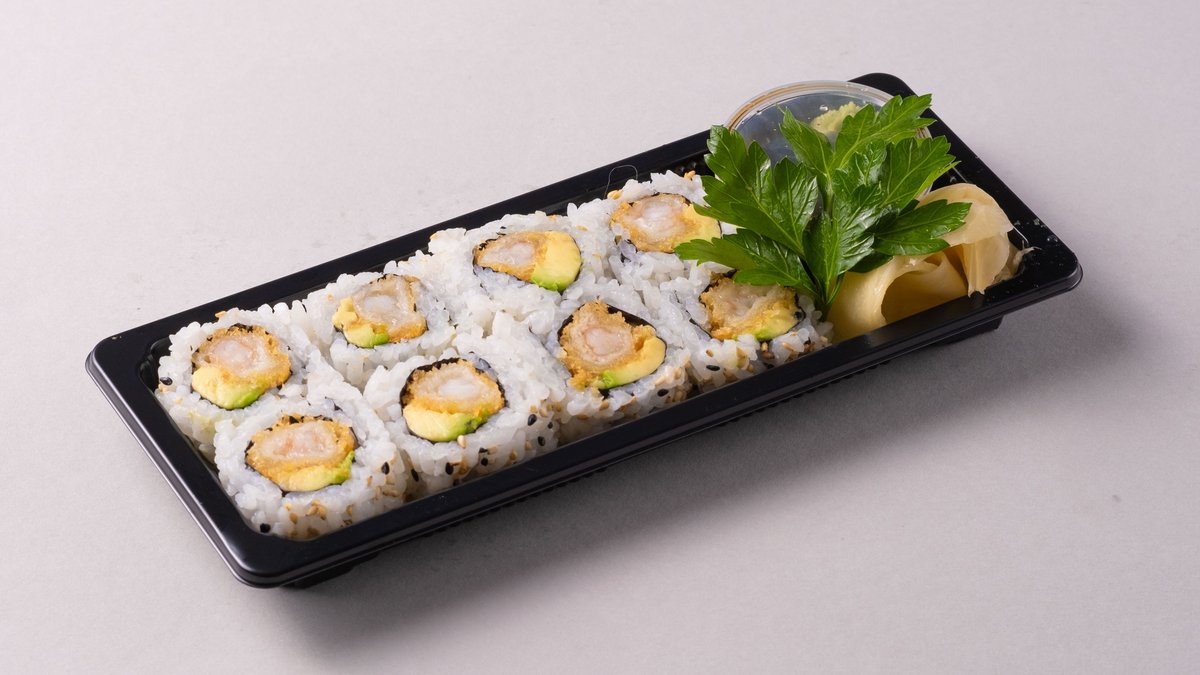 Rull med fritert innbakt scampi og avokado.