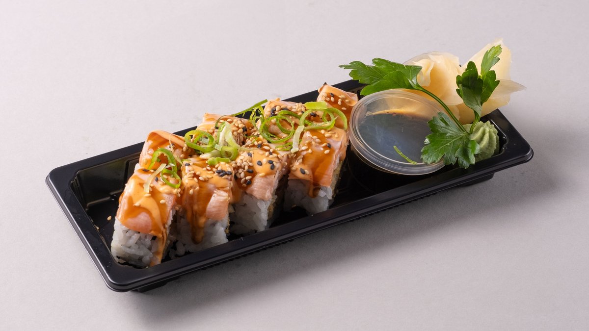 Rull m/ fritert scampi, avokado og agurk. Toppet med flambert laks, chilimayo og teriyaki saus.