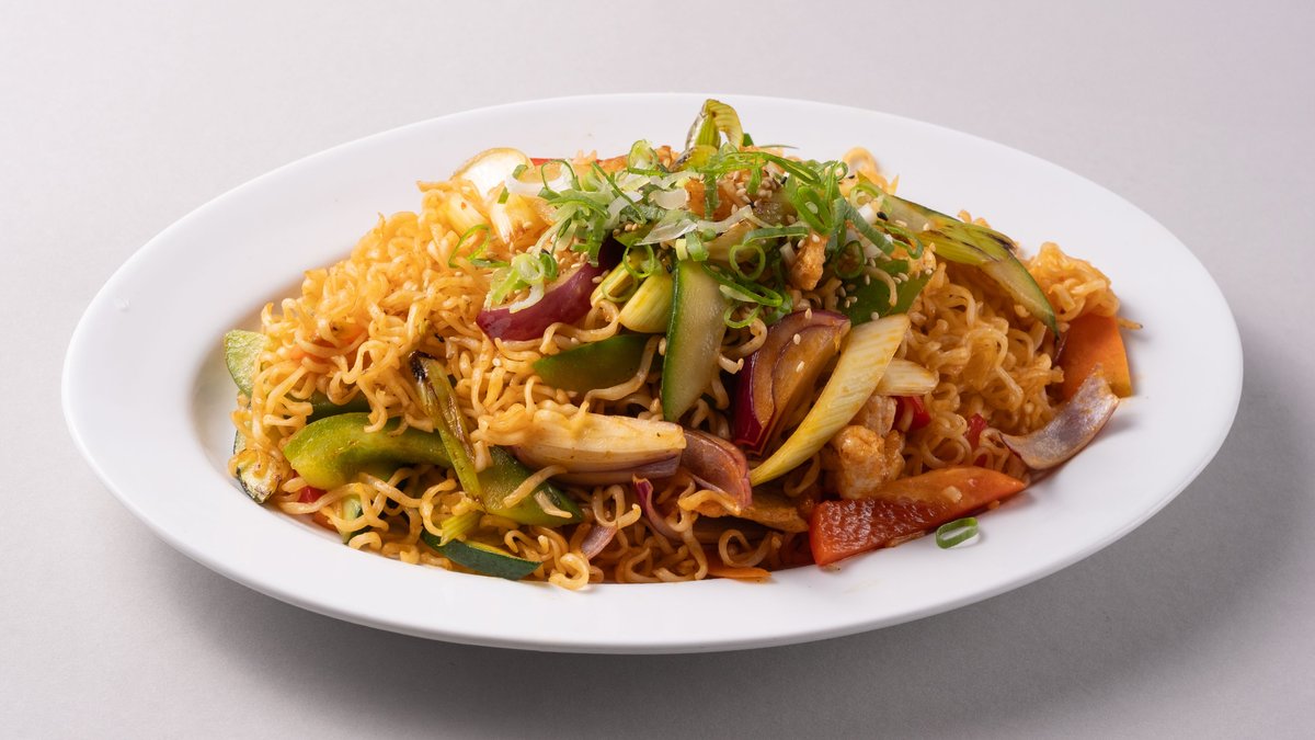 Stekte eggnudler med kylling og grønnsaker.