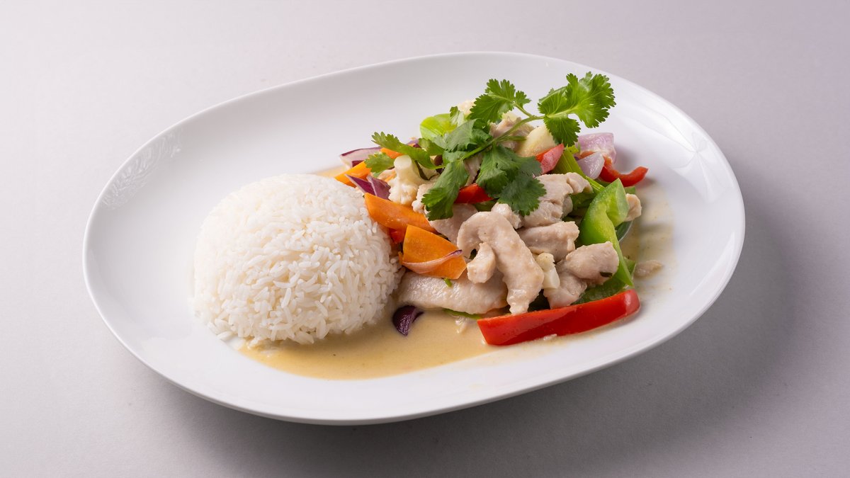 Thai wok, kylling og grønnsaker i grønn kokosmelk karri.