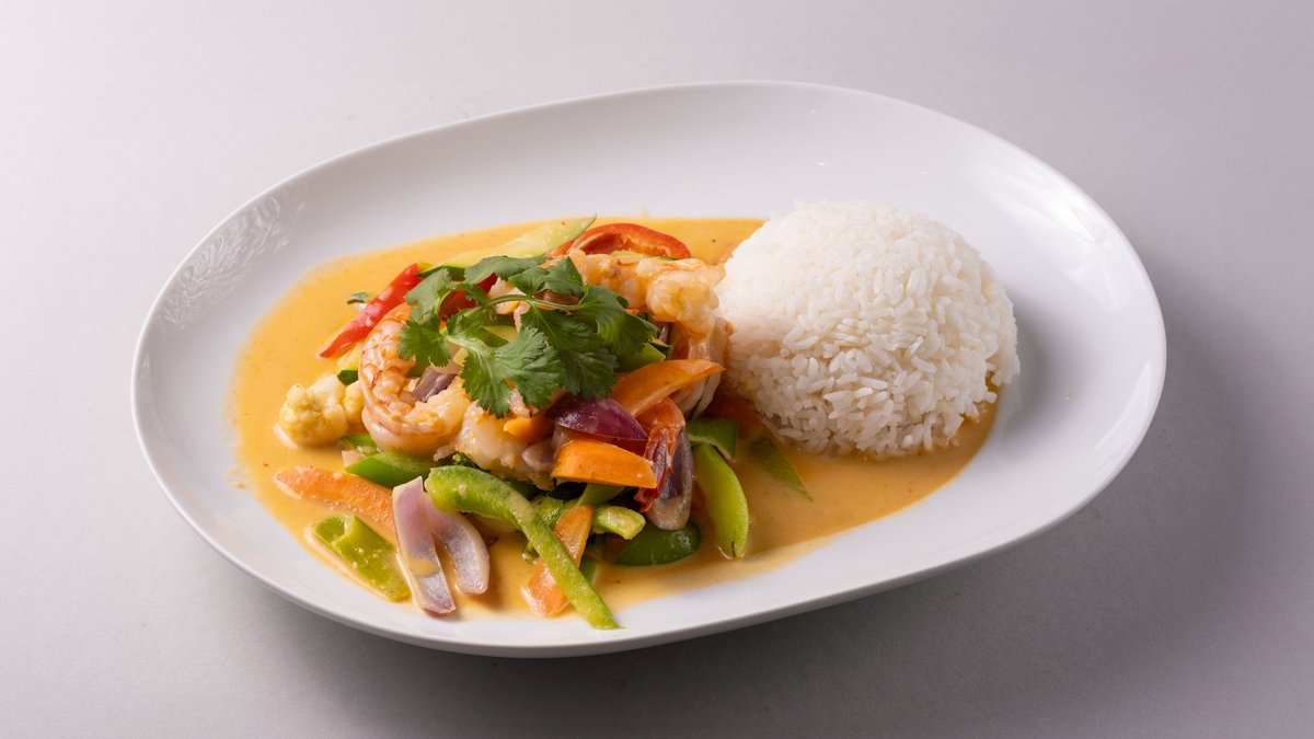 Thai wok, scampi og grønnsaker i rød kokosmelk karri.