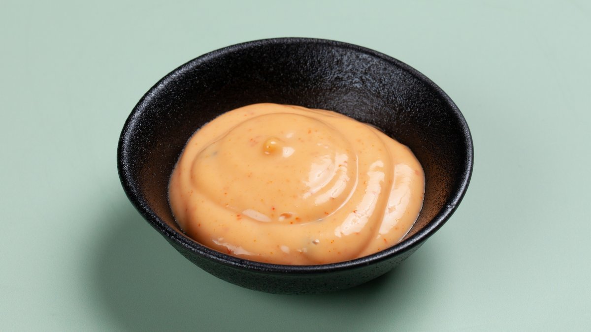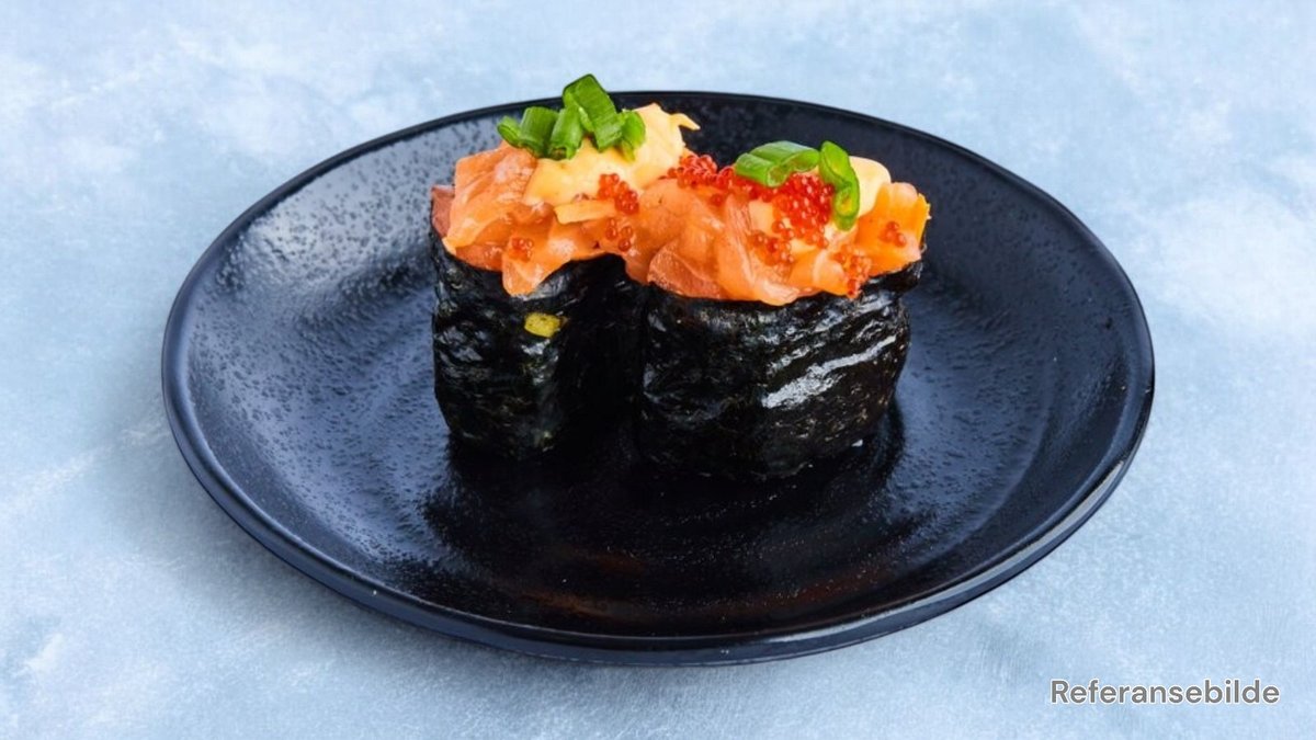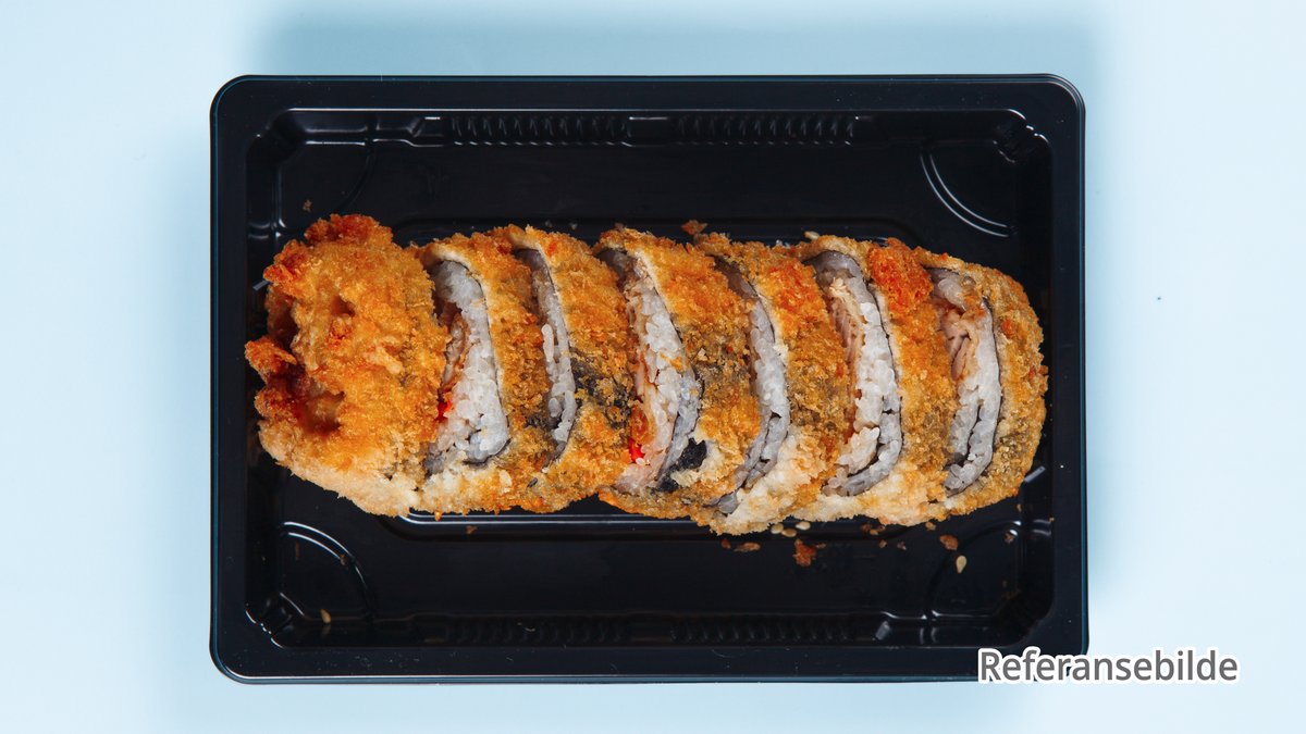 Fritert hel rull av laks, avokado og agurk. Toppet med chilimayo.